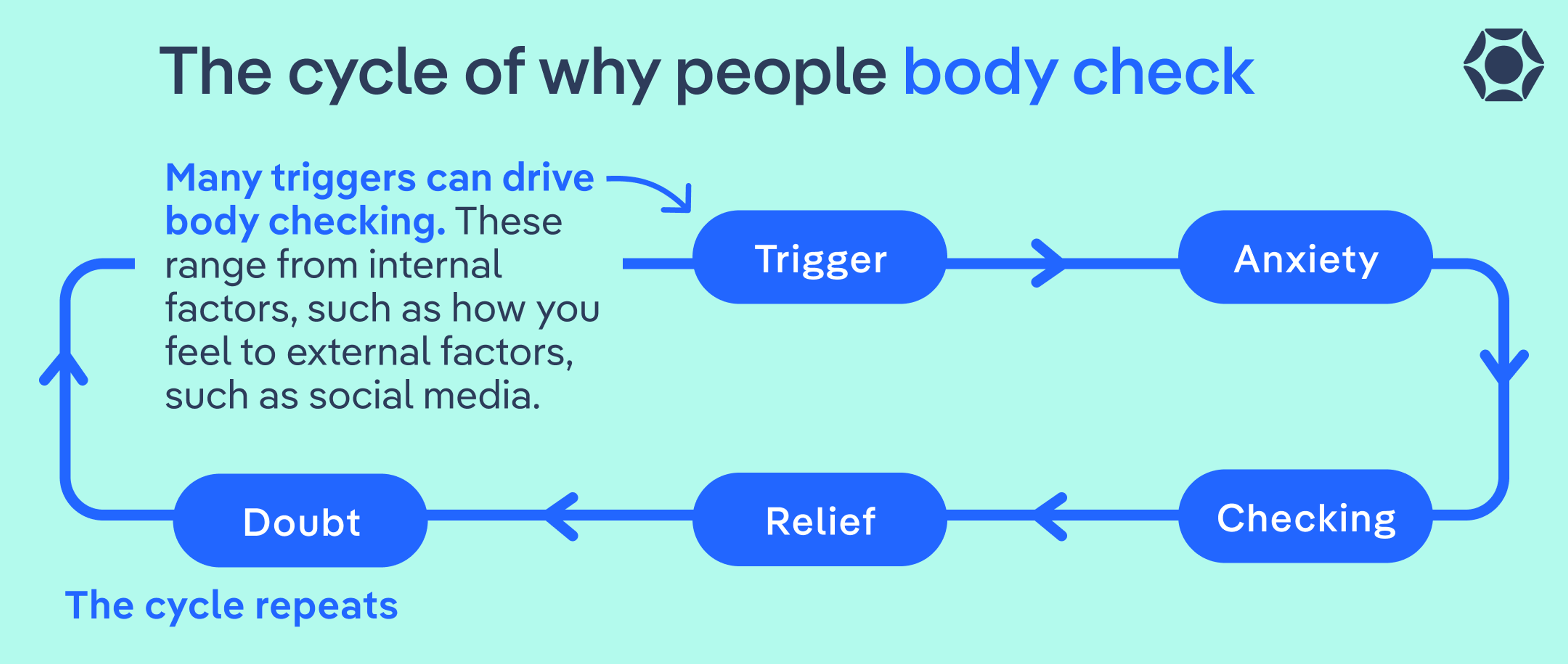 Researchers even refer to this type of behavior as a “safety mechanism.” It may temporarily bring about a sense of immediate relief from the initial anxiety or a sense of having control. But engaging in body checking also perpetuates the behavior, creating a vicious cycle. That sense of relief or of having control leads drives more body checking.