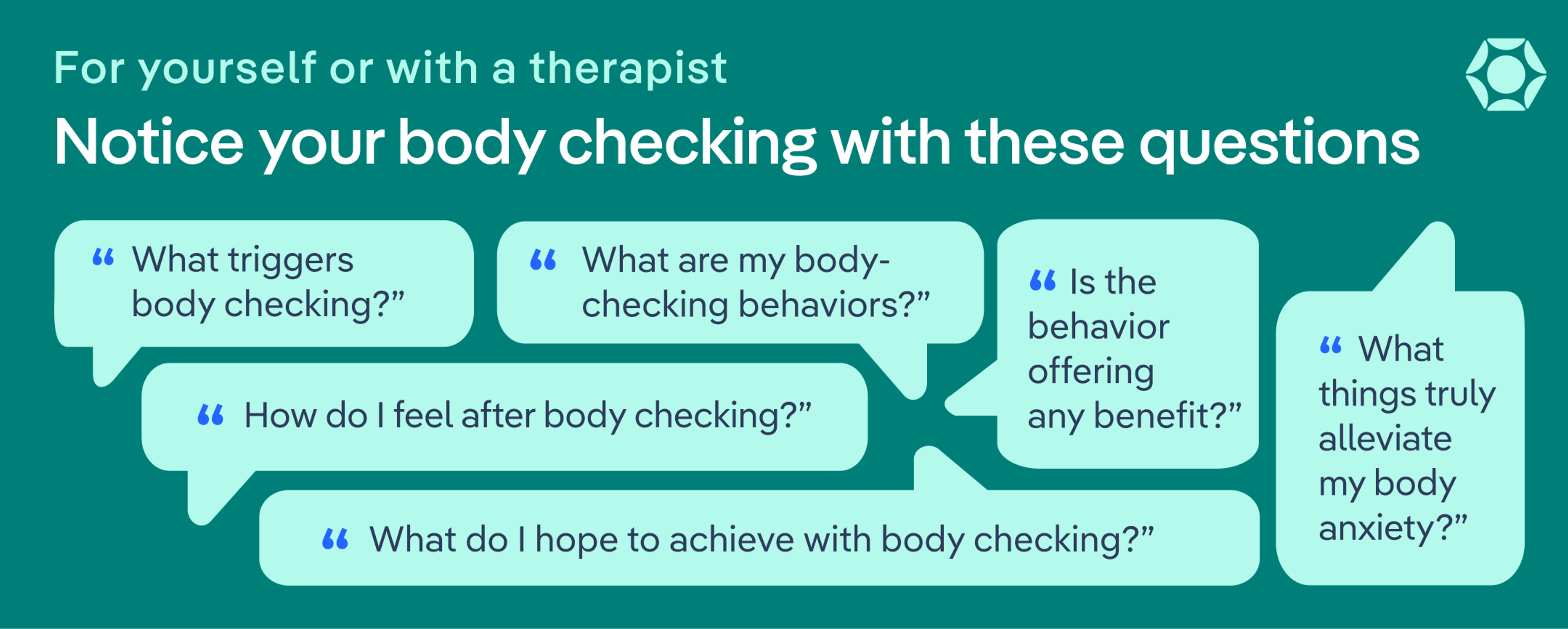 - Build awareness: “Many people don't realize they constantly touch their stomach or thighs as a form of body checking,” he says. “Building awareness of the behavior is a critical first step in being able to challenge it.”